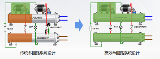磁懸浮冷水機組采用高效單回路系統(tǒng)設計,較常規(guī)變頻螺桿冷水機組有7%-21%左右的能效提升。